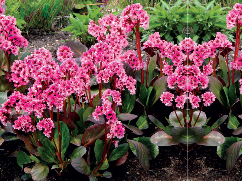 Bergenia 'Bergeniax hybrid' Flirt PBR Bergenia 'Flirt' oprócz zwartego wzrostu i jaskrawego koloru kwiatów wyróżnia się jeszcze jesiennym i zimowym przebarwieniem liści, które stają się wtedy ciemno czekoladowe. Zieloną barwę odzyskują dopiero późną wiosną, zwykle po kwitnieniu. Jest rośliną zimozieloną i bardzo tolerancyjną. Nowa odmiana znanej bergenii o miniaturowym, kompaktowym wzroście i intensywnej barwie kwiatów. Osiąga zaledwie 15 cm wysokości rozrastając się bardzo wolno do średnicy około 25 cm. Na przełomie kwietnia i maja zakwita na intensywny, różowy kolor. Bergenia lubi cień i stałą wilgotność gleby, jednak dobrze znosi też inne warunki, w tym słoneczne stanowisko oraz niedobory wody. Nie straszne jej mrozy, choroby i szkodniki.
