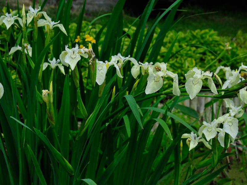 Irys, Kosacies WeissIrysy białe to silnie rosnące, wysokie, kępiaste byliny osiągające średnio 80-120cm wysokości. Wytwarzają grube, prosto wzniesione łodygi, z których wyrastają długie (do 1m), wąskie (1-3cm szerokości), mieczowate liście. Kwitną najczęściej na przełomie maja i czerwca, rzadziej w lipcu. Kwitnienie trwa około dwa tygodnie. Białe kwiaty z lekkim brązowym lub fioletowym wzorem na dolnych liściach okwiatu wyrastają na długich szypułkach. Składają się z sześciu płatków zrośniętych w rurkę. Średnica kwiatu zależy od odmiany i warunków, średnio wynosi 8-10cm. Na jednym pędzie występuje do 12 kwiatów. Owocem jest trzykomorowa torebka zawierająca dyskowate (7-8mm dł.), obustronnie spłaszczone nasiona. Kosaćce żółte wytwarzają grube, mięsiste, rozgałęzione kłącze.