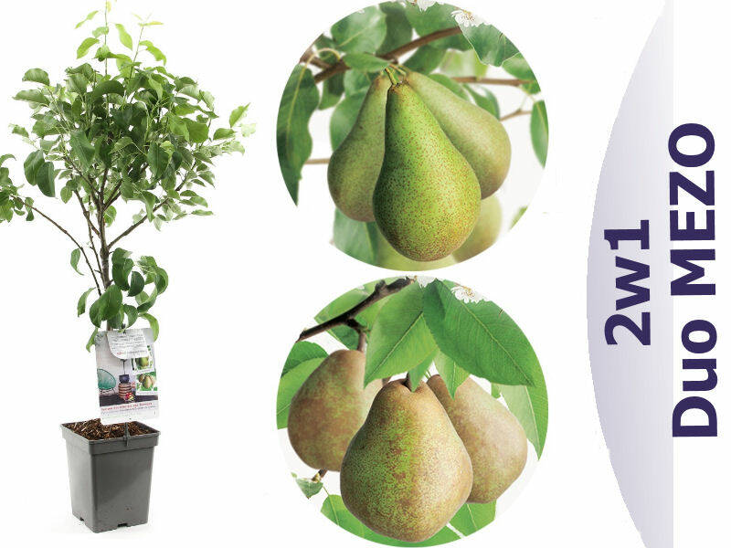 Grusza Duo Mezo Lukasówka - Bonkreta 'pyrus communis'Prium Lukasówka Drzewo rośnie silnie, jego owoce są duże lub bardzo duże, jajowato- owalne w kształcie, o skórce gładkiej, w kolorze zielono- żółtym. Miąższ jest biały, w smaku słodko- winny, soczysty, delikatny, bardzo smaczny. Owoce dojrzewają na przełomie września i października. Lubi gleby ciepłe i żyzne. Niestety ta odmiana jest podatna na parcha. Prium Bonkreta Na początku rośnie silnie, ale po wejściu w okres owocowania siła wzrostu maleje. Owoce Bonkrety są średniej wielkości, jajowate, wydłużone o nierównej, pofałdowanej powierzchni. Ich skórka jest dość cienka i gładka, trochę błyszcząca, usiana drobnymi rdzawymi przetchlinkami. W kolorze jest zielonkawożółta. Owoce dojrzewają na początku września. Ta odmiana jest średnio odporna na mróz. Dedykowane środki ochrony dla gruszy -parch gruszy - Miedziań Extra -rdza gruszy- Score 250 EC