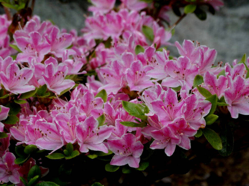 Azalia japońska Kermesina Rose Rózowa 'Rhododendron japonicum'Krzew tej odmiany posiada zwarty, gęsty pokrój i charakteryzuje się umiarkowanym wzrostem jak na azalie i dorasta do około 60cm wysokości. Odmianę tą wyróżnia zabarwienie kwiatów, które są drobne, ale bardzo szczelnie obsypują krzewy, przykrywając całkowicie liście. Przez środek płatków biegnie ciemnoróżowy pasek, brzegi natomiast są białe. Odmiana kwitnie z końcem maja i na początku czerwca.