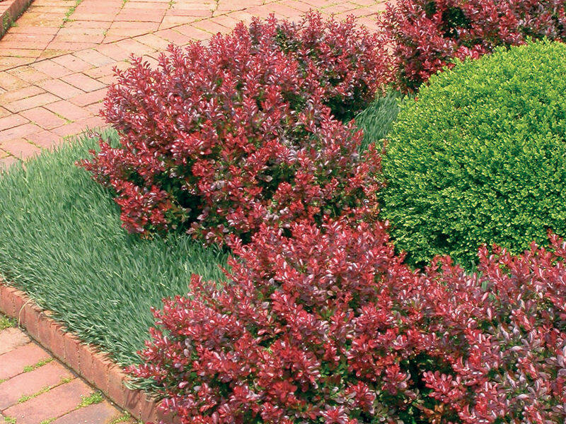 Berberys Czerwony 'Berberis' NanaKarłowy, ciernisty krzew o płaskokulistym pokroju. Dorasta do 0,6 m wys. i 1 m szer. Liście purpurowobrązowe. Jesienią przebarwiają się na kolor szkarłatny. Wymaga stanowiska słonecznego, gleby od całkiem kwaśnej do umiarkowanie alkalicznej. Odporny na niskie temperatury i silne wiatry. Dobrze znosi cięcie.