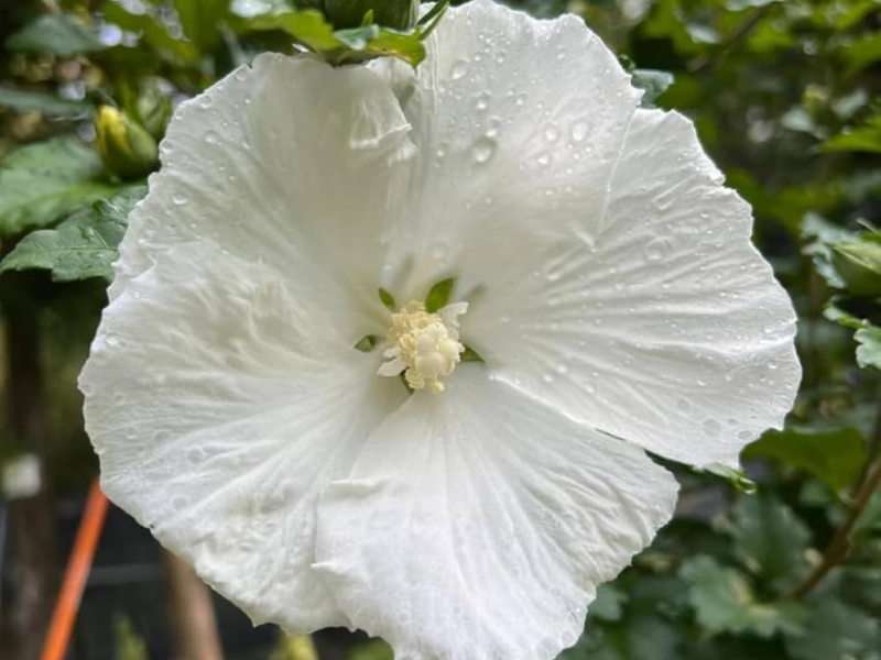 Hibiskus Bagienny 'Hibiscus moscheutos' White angelHibiskus bagienny ‘White Angel’ to efektowna, silnie rosnąca odmiana o dużych, czysto białych kwiatach z delikatnym, kremowym odcieniem. Należy do grupy hibiskusów bylinowych (tzw. hibiskusów bagiennych), które tworzą potężne, zielne krzewy o spektakularnym kwitnieniu latem.